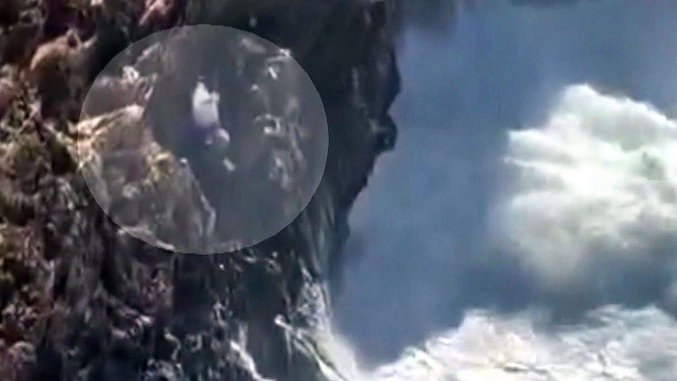 Seven tourists who became trapped by high tide managed to climb up the rocky cliff to a thin ledge where they huddled for hours before rescue crews arrived.