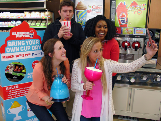 On March 18 and 19 from 11 a.m. to 7 p.m., you can bring any food-safe receptacle to 7-Eleven, as long as your container of choice fits inside the 10-inch cutout on the in-store display.