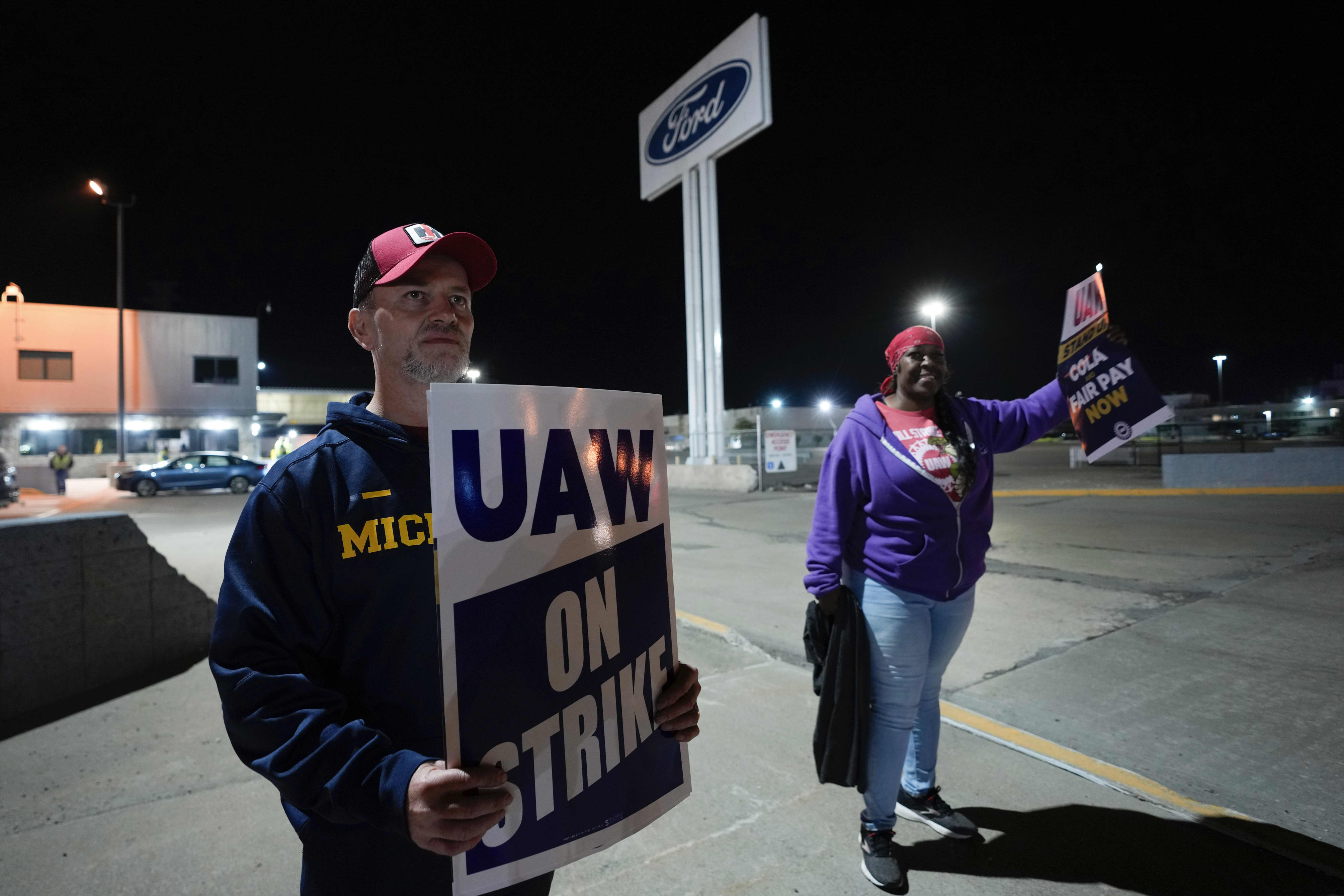 United Auto Workers members Bryan Horvath and Ann Hardy picket at Ford's assembly plant in Wayne, Mich., early today. Paul Sancya / AP