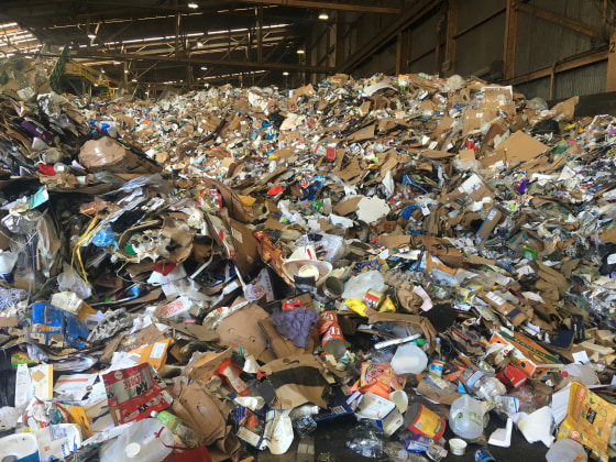 "People are ordering a lot more things online, and they arrive in small- and medium-sized cardboard boxes, and so you can see it right here," Reed told NBC's Jo Ling Kent, standing beside the plant's massive pile of cardboard, hard plastics, paper, and bottles.