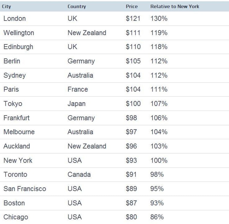 U.S. cities don't even break the top 10. The closest is New York, which comes in at No. 11 at $93, just under Auckland's $96.