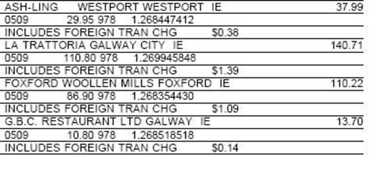 A Red Tape Chronicle reader named Russ called my attention to the fees last week. He'd gone to Canada with his wife, as he has many times, but this time, there were surprising extra dings on his bill. For example, dinner at a restaurant for $29.96, and just below it, a 30 cent charge. Russ, who asked that I withhold his name because he works for a large bank that issues credit cards, sent me scrambling for my most recent credit card bill. And sure enough, for each charge I made in Ireland recently, there was a small charge listed below labeled "foreign tran chg." Dinner for friends $140.71, fee $1.49. Scarf and sweater $110.22 -- fee $1.09. Lunch $13.70, fee 14 cents.