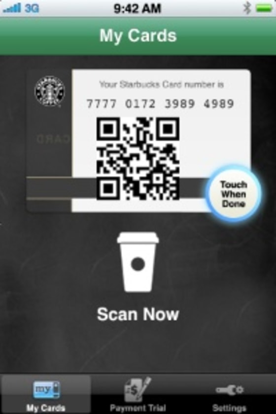 I downloaded the Starbucks app in about a minute using the store's free Wi-Fi. The app told me immediately that I needed to link it to a Starbucks gift card, so I bought one of those for $10. I sat down, entered the card number into the app, waited about 30 seconds, and my app registered my new $10 balance. I then went back to the counter and ordered my coffee and a small vanilla bean scone. The cashier pointed to the bar-code reader on the counter and asked me to wave my iPod Touch under it. I pressed the "touch to pay" button on the screen, a bar code image appeared, and my purchase registered instantly. My app immediately indicated I had $7.41 cents left in my account.