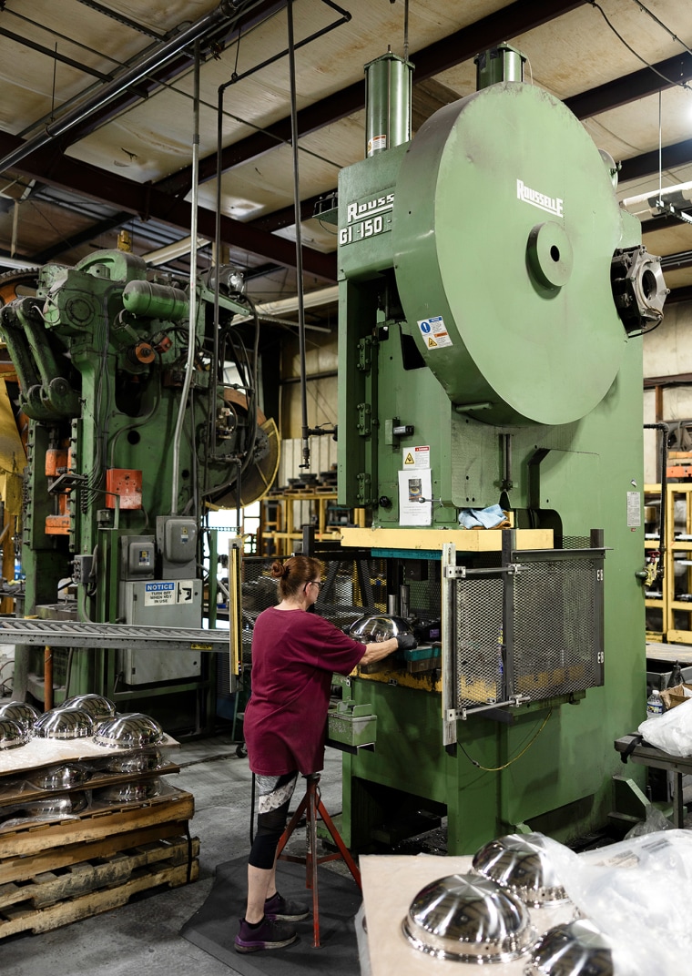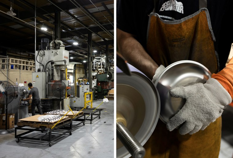 The company imports its handles, made from pure stainless steel using a process called lost-wax casting, from China. Meanwhile, the company purchases the material for its stainless steel lids in the U.S. Those parts don’t have to be cladded and are a more simple single layer of stainless steel that’s more widely available.