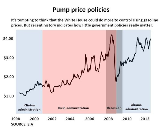 Recent history seems to have borne out that view. Despite the recent Bush administration's strong support for the oil and gas industry, pump prices rose from a low of about $1.20 a gallon in 2002 to a peak of $4 a gallon before crashing below $2 shortly before Bush left office in 2009 as the full force of the recession kicked in and abruptly cut demand. Shortly after Obama took office, prices began a steady climb again and kept rising, but the remain just shy of the 2009 peak.