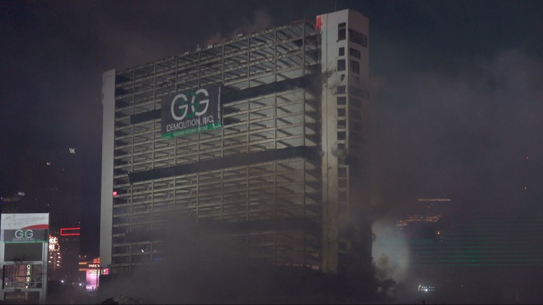 The 22-story resort hotel, which opened in 1957 and featured in the 1971 James Bond film “Diamonds Are Forever” and “The Godfather” the following year, closed its doors April 2. But it didn’t go down in darkness: In true Vegas fashion, the city turned the building’s 2:30 a.m. implosion into a party, replete with a drone and a fireworks display.
