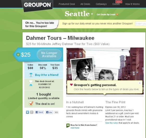 “Give yourself the creeps with this Groupon,” the text of the deal read, inviting participants to explore Milwaukee’s Walker's Point area, where Dahmer hunted for some of his victims.