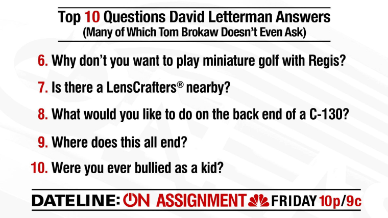 Here are the top 10 questions David Letterman answers in his interview with Tom Brokaw, narrated by Dateline's Keith Morrison. The full interview airs Friday, June 17 at 10/9c.June 15, 2016