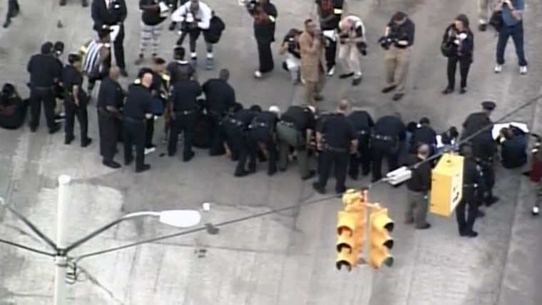 Latoya Caldwell, a Wendy's worker, sat near the edge of the group in the street wearing a t-shirt that read "Stand Up KC" and beside a woman holding a sign bearing the face of Rosa Parks. Caldwell was arrested and loaded into a van.