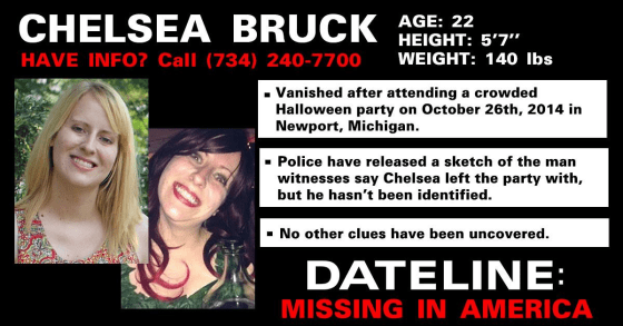Chelsea Bruck was last seen leaving a crowded Halloween party around 3:00am on October 26th, 2014 in Newport, Michigan.