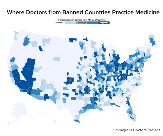 The new research from economists and medical professionals at Harvard and MIT found that doctors from the countries affected by Trump's latest immigration-related executive order — Iran, Somalia, Sudan, Yemen, Syria and Libya — have tended to cluster in states like Indiana, Michigan, Ohio, Pennsylvania and West Virginia. Residents of working class areas in those states tend to have higher incidences of health problems like obesity, diabetes, and alcoholism and also tended to give Trump big boosts of support in the election, according to The Economist.