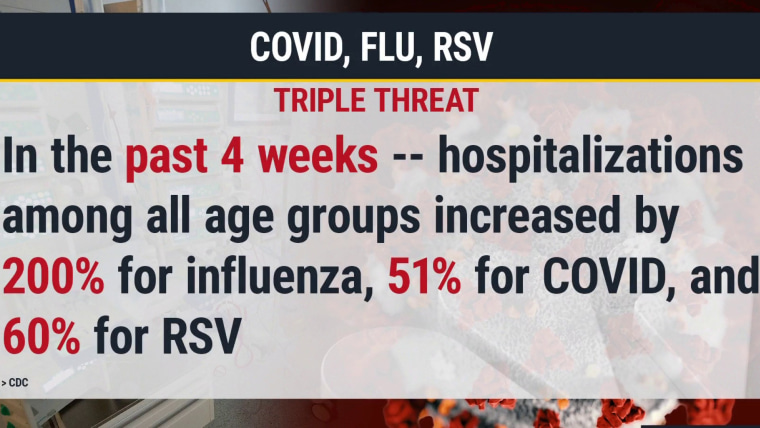 Covid, flu and respiratory syncytial virus (RSV) are all circulating widely. As of Dec. 16, flu hospitalizations had increased nearly 200% over the previous four weeks. And Covid hospitalizations increased around 40% over the four-week period ending Dec. 9, the latest data available.