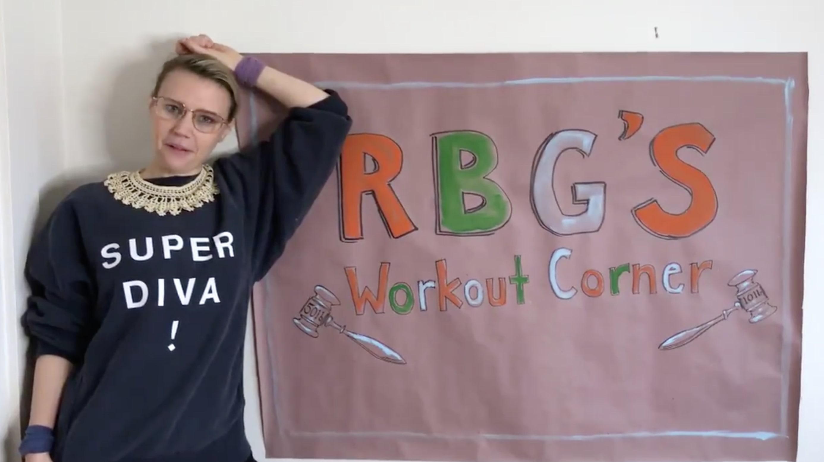 Saturday Night Live's Kate McKinnon portrays Ruth Bader Ginsberg teaching a workout class in her skit from home on Saturday. NBC