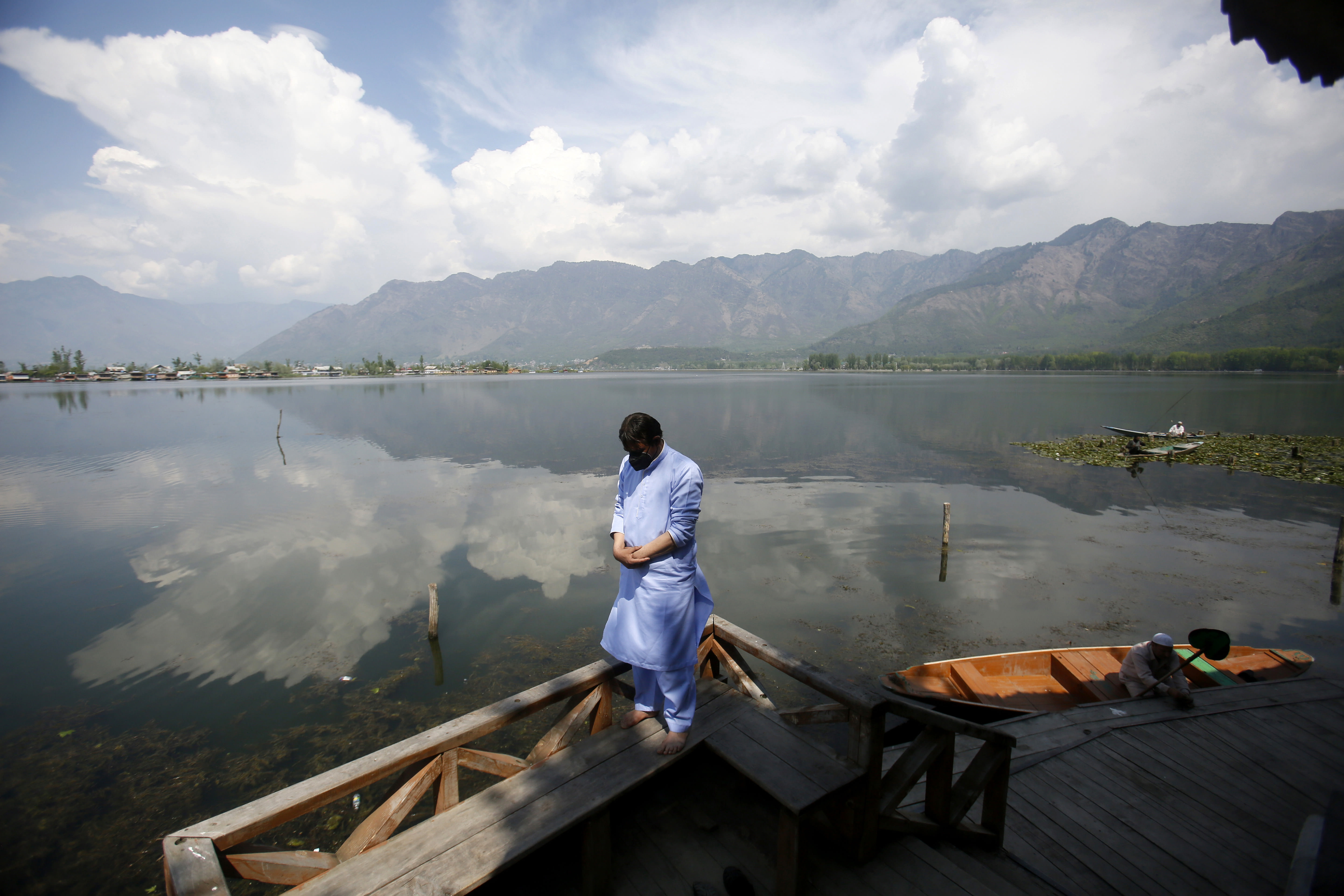 A Kashmiri Muslim man offers prayer on the banks of Dal Lake on the second day of Ramadan during lockdown in Srinagar, Indian controlled Kashmir on Sunday. Kashmiri shrines usually packed with devotees during the holy month of Ramadan were deserted as authorities closed the shrine for public safety. Mukhtar Khan / AP