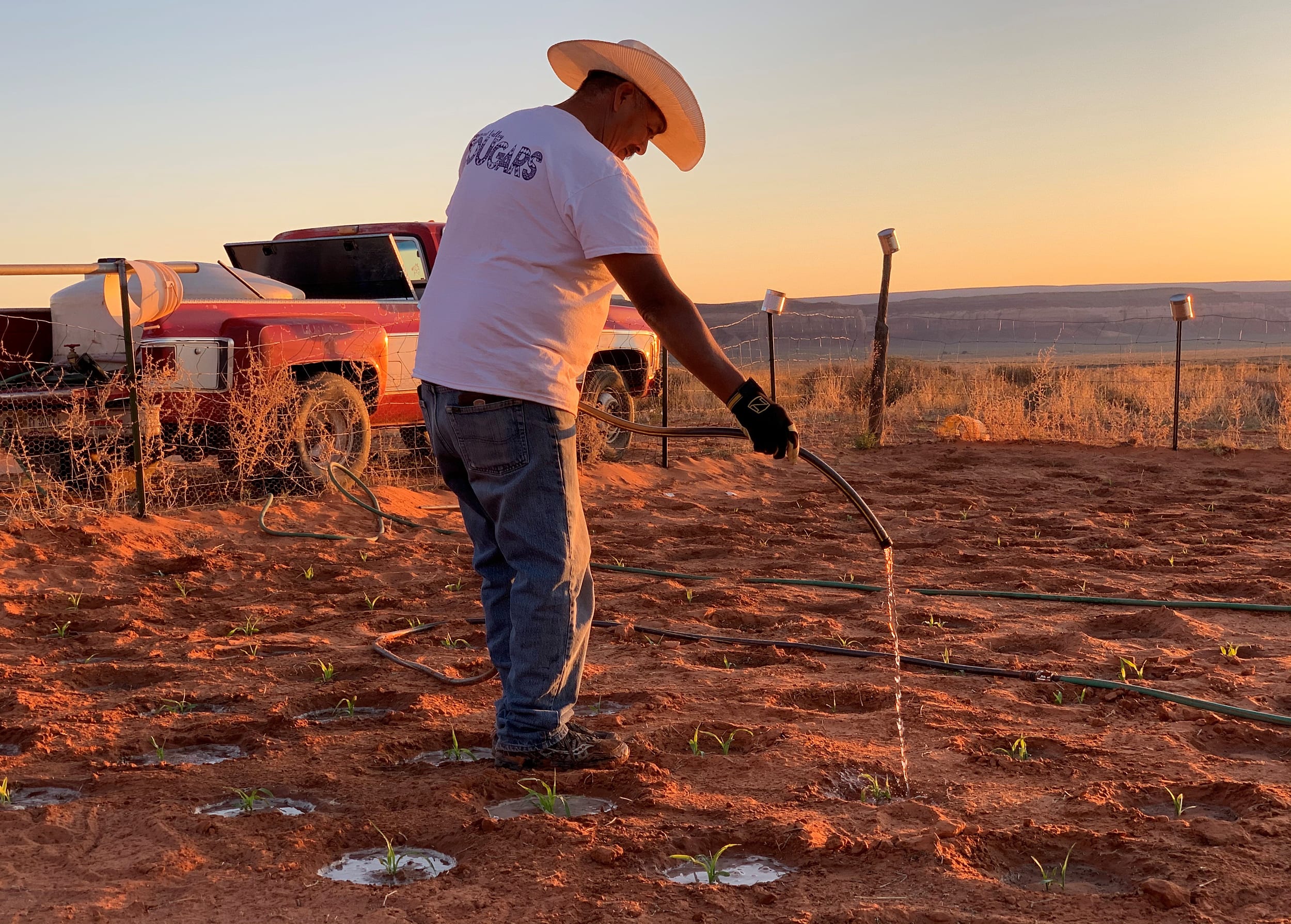 Henry Wilson Sr. waters the family's crops outside of their home in Monument Valley, Utah, on the Navajo Nation. Cynthia Wilson