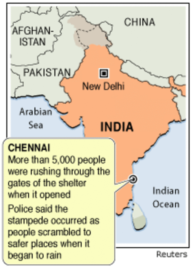 This was the second such incident in Madras, the capital of Tamil Nadu state, in the past two months. In November, six people were killed and 20 injured in another stampede near a relief camp in a northern district.