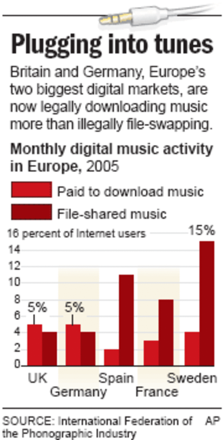 The International Federation of the Phonographic Industry, or IFPI, said the legitimate music business was gradually gaining ground on digital piracy. It said research showed that in Europe's two biggest digital markets — Britain and Germany — more music fans are now legally downloading music than illegally file-swapping.