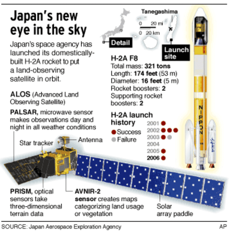 The satellite — which is called “Daichi,” a word that means the earth or ground in Japanese — is designed to gather detailed topographical data. Possible uses include helping to monitor disaster-hit areas or searching for natural resources.