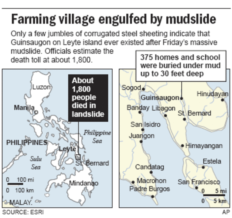Meanwhile, a landslide killed five people on another Philippines island hundreds of miles away, but it was not immediately clear what caused it.