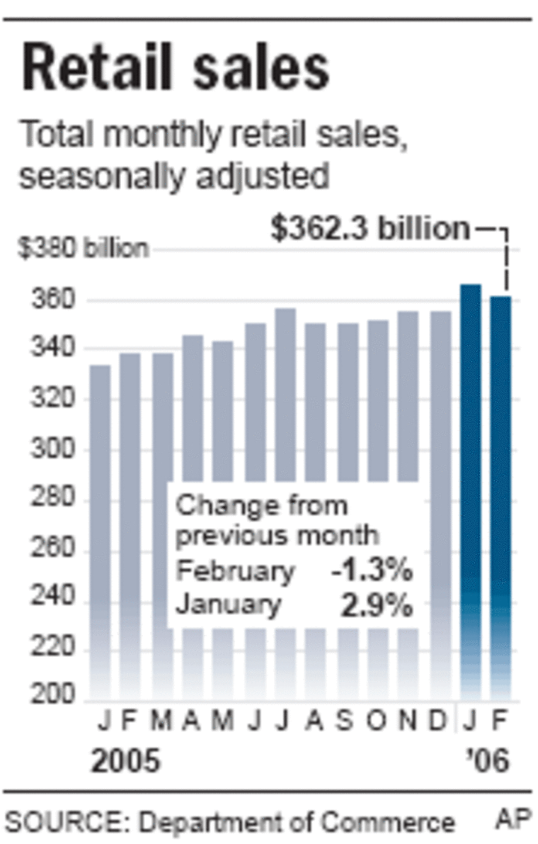 Retail sales excluding gasoline were down 1.3 percent in February after being up 2.8 percent in January.