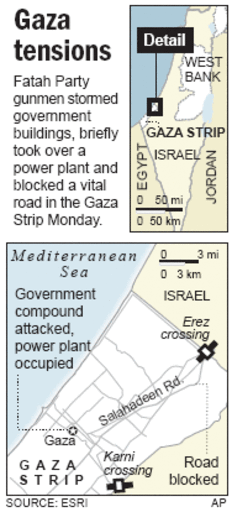 Two dozen gunmen also briefly infiltrated Gaza’s power plant, exchanging fire with police, officials said. Gunmen also briefly entered a military hospital near the central Gaza city of Khan Younis, and militants and police engaged in a gunbattle outside a police compound.