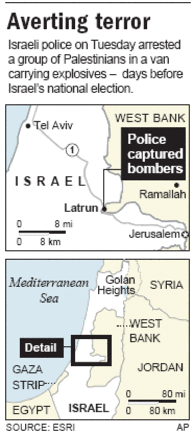 Elite police commandos chased down a group of Palestinians racing toward central Israel in a van packed with explosives Tuesday, foiling a potentially devastating bombing just days before national elections.