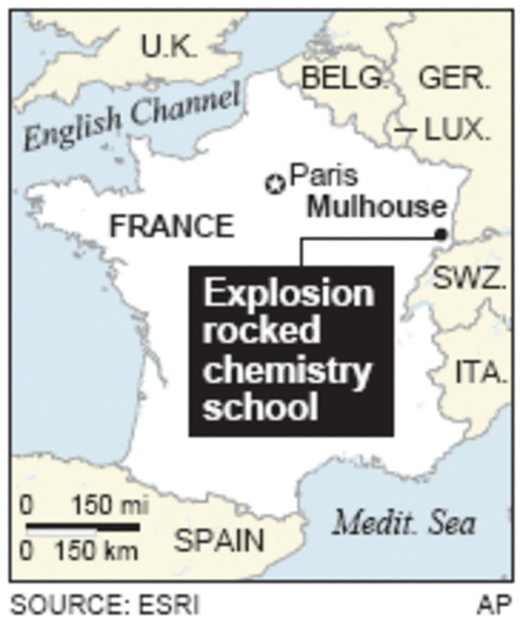 The blast occurred on the ground floor of the Superior National School of Chemistry in Mulhouse, near France's border with Germany, and was followed by a fire, officials said.