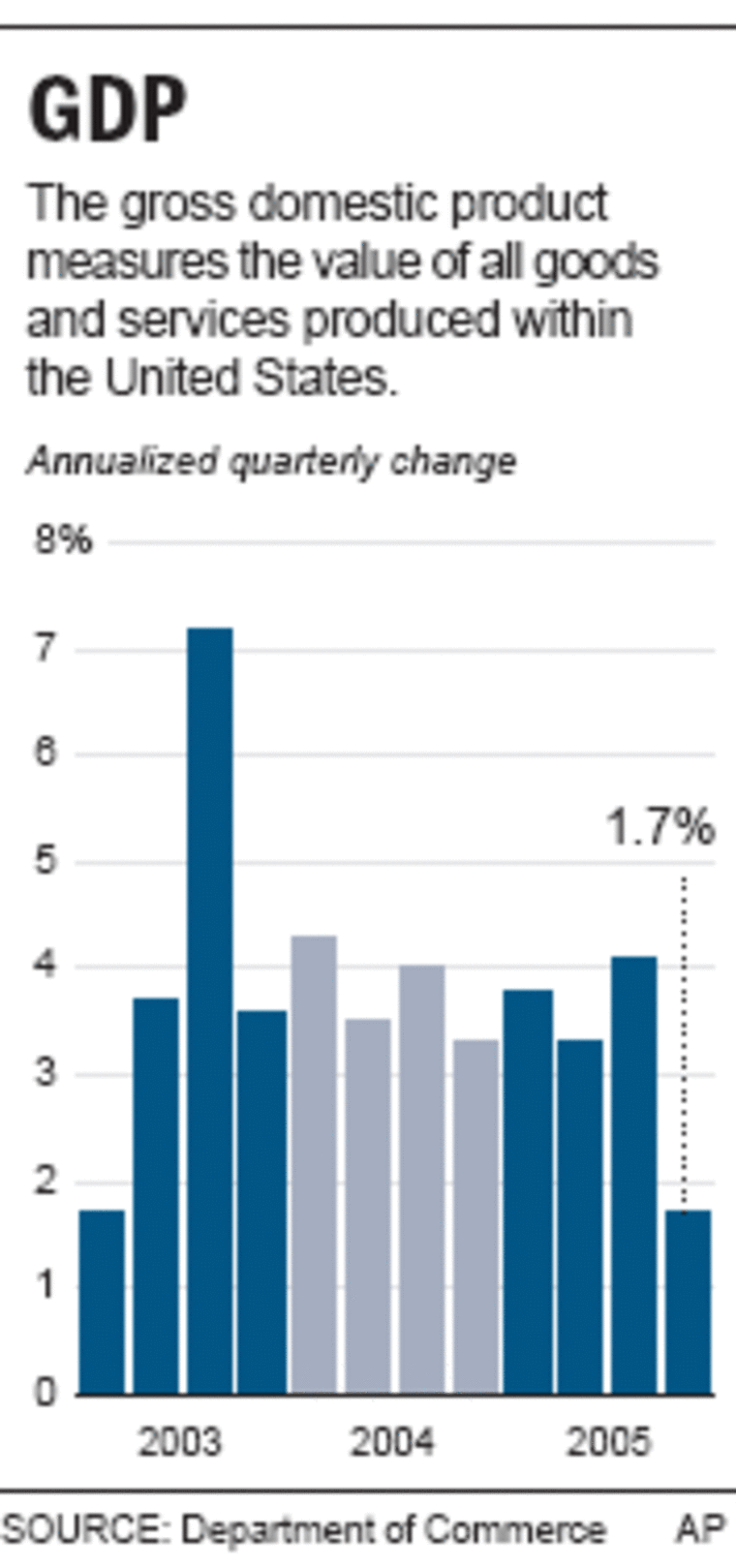 Gross domestic product grew at an annual rate of just 1.7 percent in the October-to-December quarter, the Commerce Department reported Thursday. It was the most sluggish showing in three years but was a tad better than the 1.6 percent estimated a month ago.