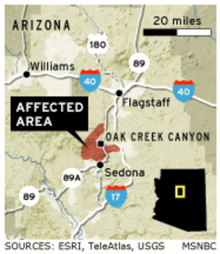 The fire, which officials believe began Sunday at a transient camp, forced the evacuation of about 400 homes and businesses in narrow Oak Creek Canyon and about 100 homes in the smaller canyons on the rugged north side of Sedona, a town about 90 miles north of Phoenix surrounded by red-hued cliffs that draw builders of expensive homes and thousands of tourists.