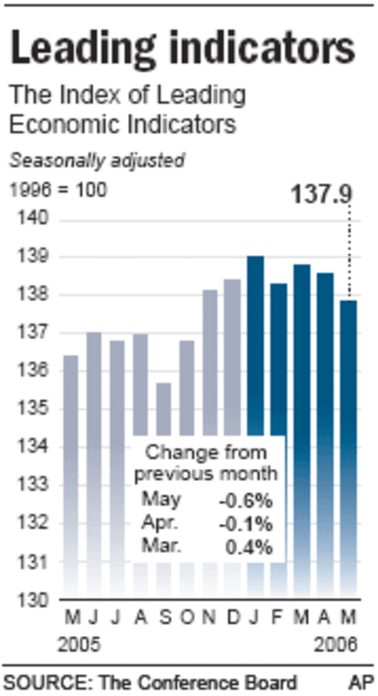The Conference Board, an industry-backed research group, said its Index of Leading Economic Indicators fell 0.6 percent to 137.9 in May after it declined 0.1 percent to 138.7 in April.