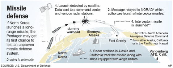 The U.S. missile defense program is a downscaled land-and-sea version of a global defense network first proposed by Reagan that was dubbed “Star Wars” by critics. Interceptor missiles — linked to a network of satellites, radar, computers and command centers — are designed to strike and destroy incoming ballistic missiles.
