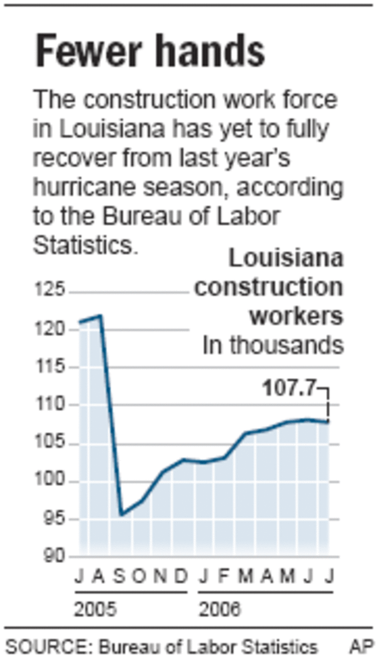 The worker shortage has been tempered by the estimated 100,000 Hispanic workers who moved to the Gulf Coast region after last year’s storm. One-quarter of the workers in New Orleans after Katrina are undocumented Latinos, according to a recent study by researchers from Tulane University and the University of California at Berkeley.
