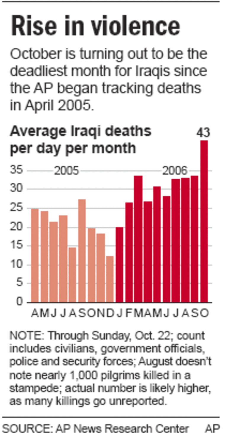 According to an Associated Press count, October is on track to be the deadliest month for Iraqis since the AP began tracking deaths in April 2005. Through Sunday, October 22, at least 941 Iraqis have been killed in war-related violence, an average of 43 every day.