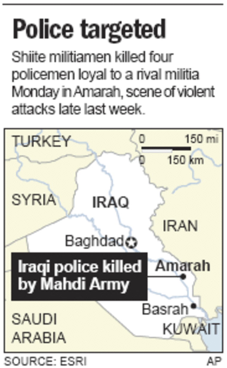 Militiamen loyal to an anti-American cleric re-emerged Monday in the southern city of Amarah, hunting down and killing four policemen from a rival militia in a brutal Shiite-on-Shiite settling of scores.