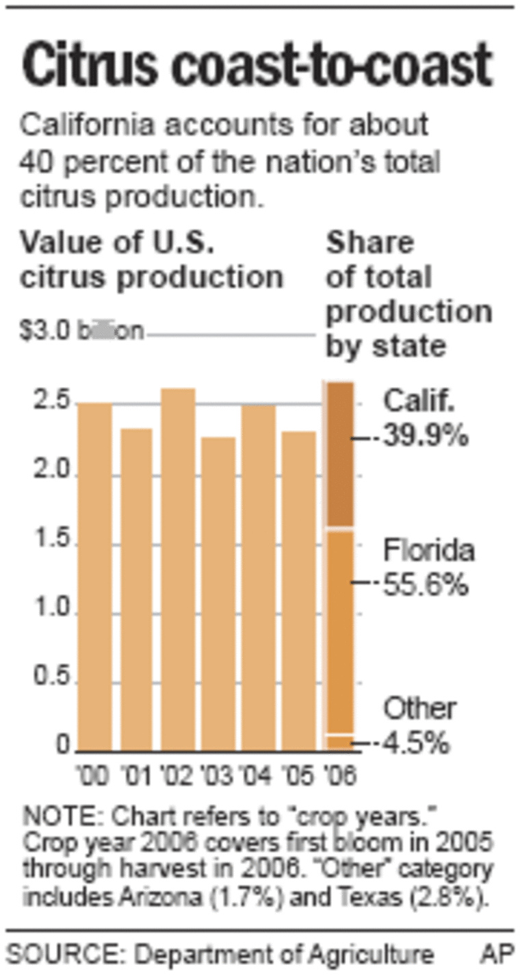 California is the nation’s No. 1 producer of fresh citrus, growing about 86 percent of lemons and 21 percent of oranges sold in the U.S., according to the California Farm Bureau. Florida produces more citrus overall, mostly for use in orange juice, according to the USDA.