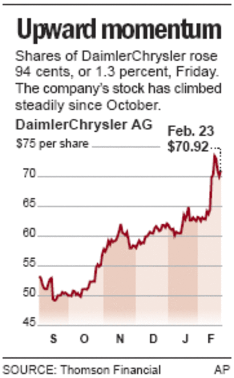 DaimlerChrysler shares edged higher Monday on a news report that the automaker was considering taking a stake in General Motors Corp. in exchange for its struggling Chrysler unit.