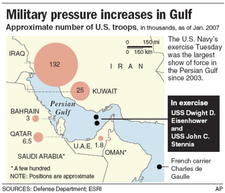 The U.S. exercises come just four days after Iran’s capture of 15 British sailors and marines who Iran said had strayed into Iranian waters near the Gulf. Britain and the U.S. Navy have insisted the British sailors were operating in Iraqi waters.