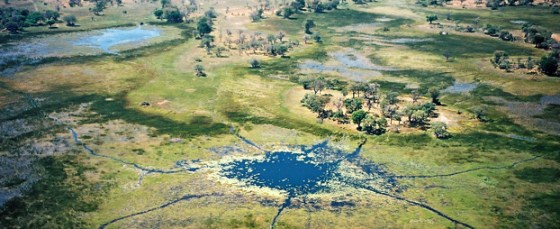 In this aerial view of Botswana's flooded Okavango Delta, animal tracks are seen cutting through marshland towards a watering hole.