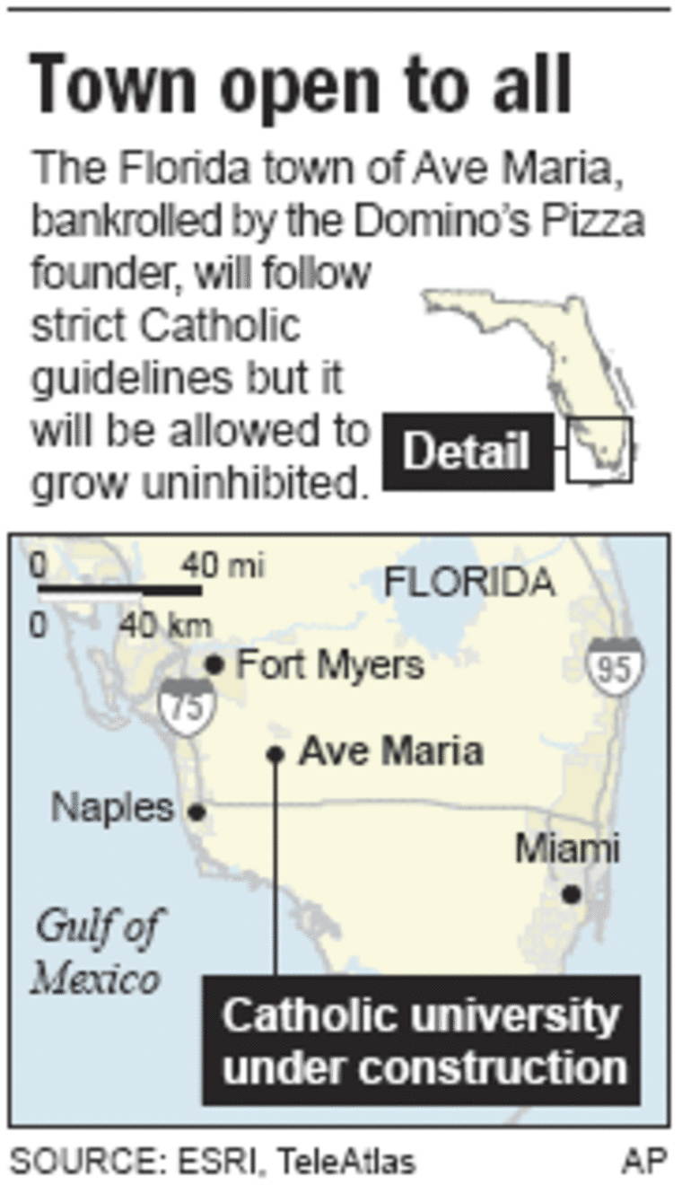 But Ave Maria is open to everyone, said Blake Gable, project manager for the Barron Collier Cos., which is building the new town in partnership with Domino’s Pizza founder Thomas Monaghan, an ardent Catholic.