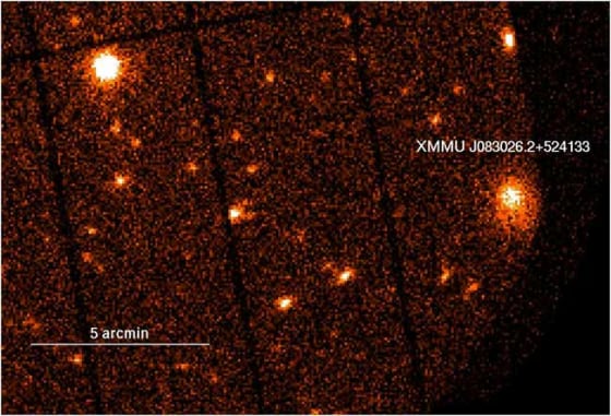 Lamer and his team discovered the cluster, known by its catalogue number, 2XMM J083026+524133, by chance while they were surveying a portion of sky for a catalogue of X-ray sources. Using the European Space Agency's orbiting X-ray observatory XMM-Newton, they spotted an extremely bright object without any galaxy visible in optical light nearby.