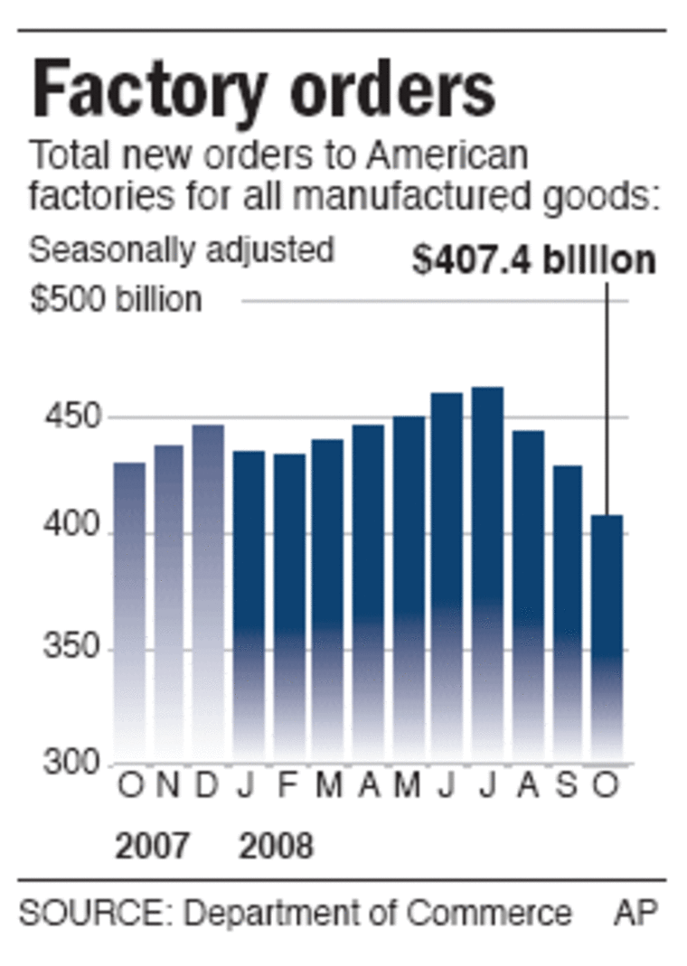 Orders to U.S. factories plunged in October by the sharpest amount in over eight years as a deepening recession caused big cutbacks in demand for steel, autos, computers and heavy machinery. Analysts expect the weakness will continue for some time.