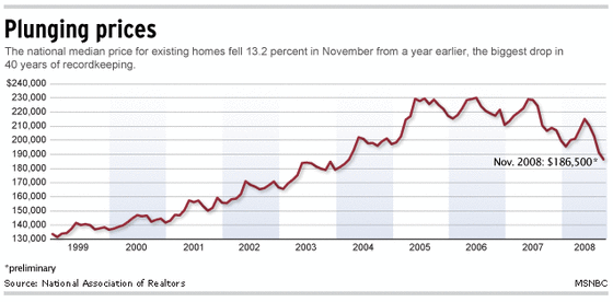 Sales of existing homes fell 8.6 percent, far more than the 1.6 percent drop expected, to an annual rate of 4.49 million in November — the slowest pace in more than 17 years. The median sales price fell by 13.2 percent from a year ago, the largest in the 40 years records have been kept, to $181,300. The price drop was probably the largest since the Great Depression, said Lawrence Yun, chief economist for the National Association of Realtors.