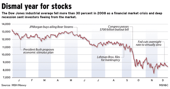 That includes msnbc.com editors: Our survey allowed readers to choose from a fairly narrow range, with a worst-case scenario showing the Dow losing 10 percent or more. In fact, the Dow Jones industrial average was down 33.8 percent for the year.