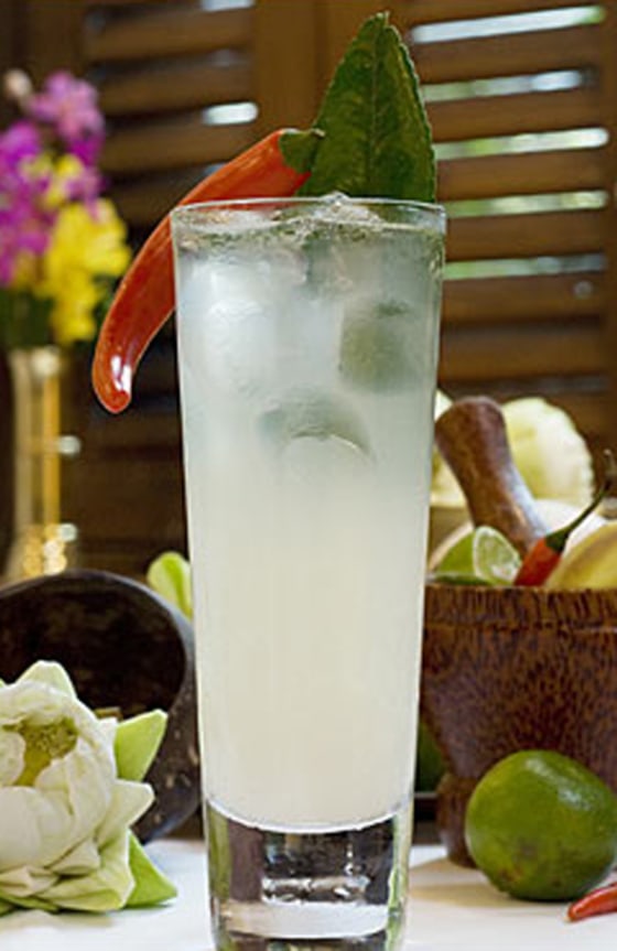 - Crush the small Thai chilli pepper, young ginger, Kaffir lime leaf, and lemon grass together in a shaker to bring out the aroma and flavour of the Thai herbs.