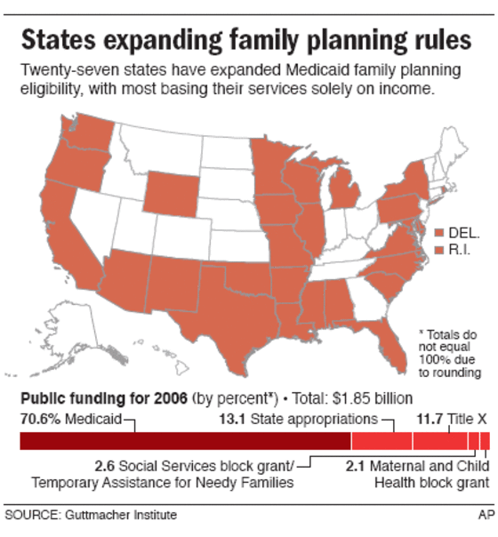 - Public expenditures for family planning in 2006 totaled $1.85 billion, with 71 percent of the funds coming from the joint federal-state Medicaid program. Twenty-seven states have expanded eligibility for family planning for low-income women who otherwise wouldn't qualify for Medicaid.