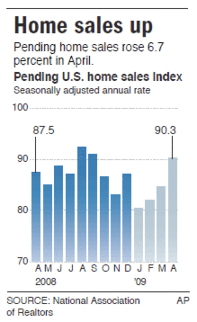 The National Association of Realtors said Tuesday its seasonally adjusted index of sales contracts signed in April surged 6.7 percent to 90.3, far exceeding analysts' forecasts. It was the biggest monthly jump since October 2001, when pending sales rose 9.2 percent.