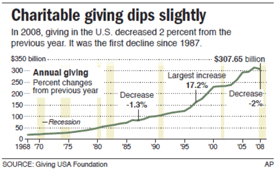 The last previous overall drop in giving was in 1987, the year of the record-shattering Black Monday stock market collapse.