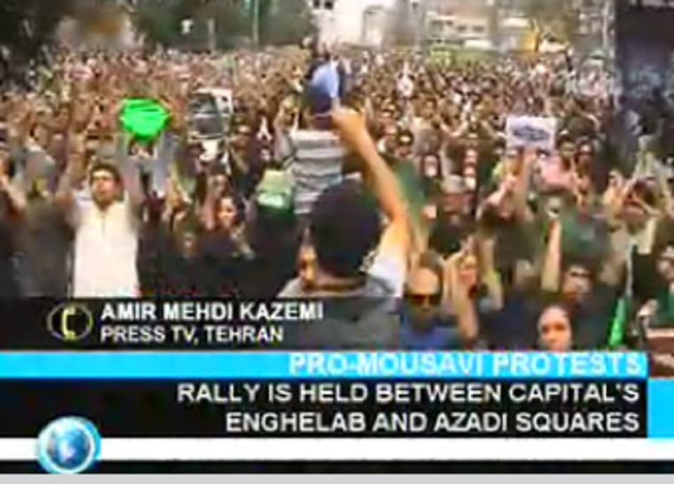 Update | 9:59 a.m. The Web site of Press TV, Iran’s state-supported, English-language broadcaster, confirms that a large opposition rally is underway in Tehran. The Web site is overloaded at the moment and none of the articles or videos there can be downloaded, but the Press TV home page displays this video still of the protest in Tehran: