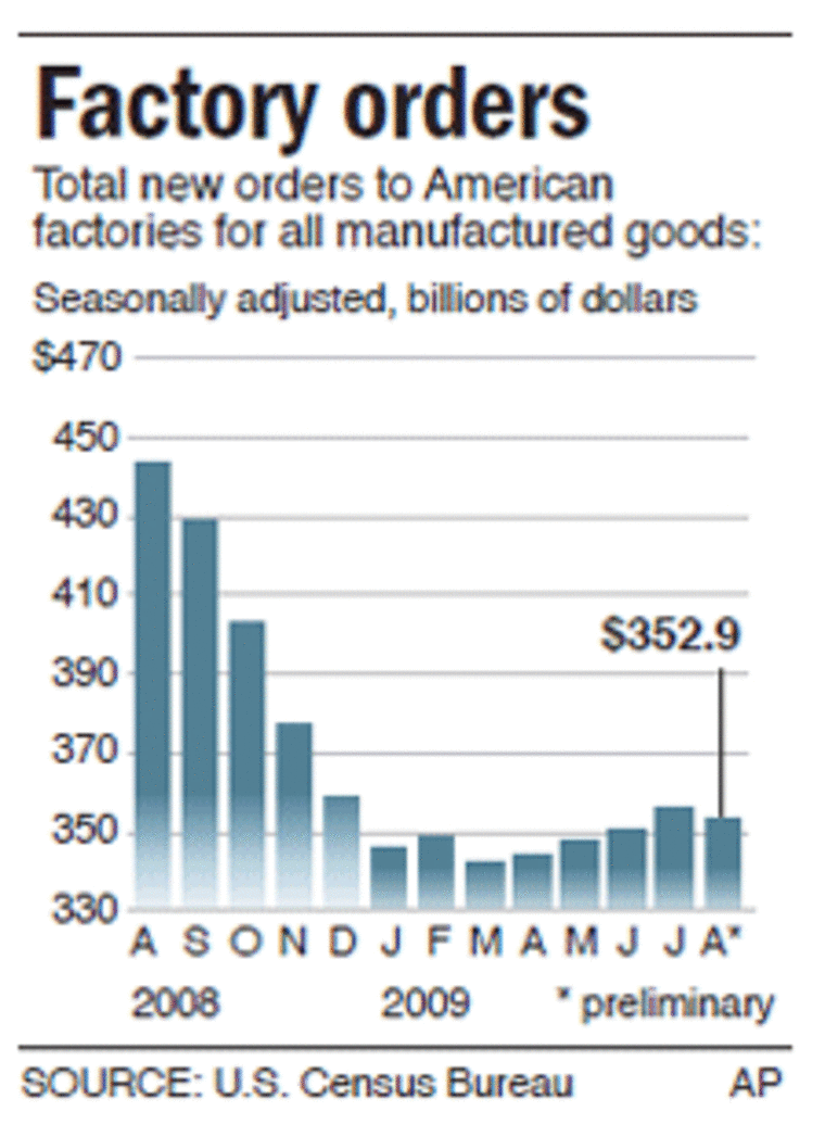 Transportation orders overall fell 9.1 percent, after a 17.8 percent July increase. Orders for motor vehicles and parts did rise 2 percent, but economists expect demand to slip in coming months as car sales plunged in September following the end of the clunkers program.