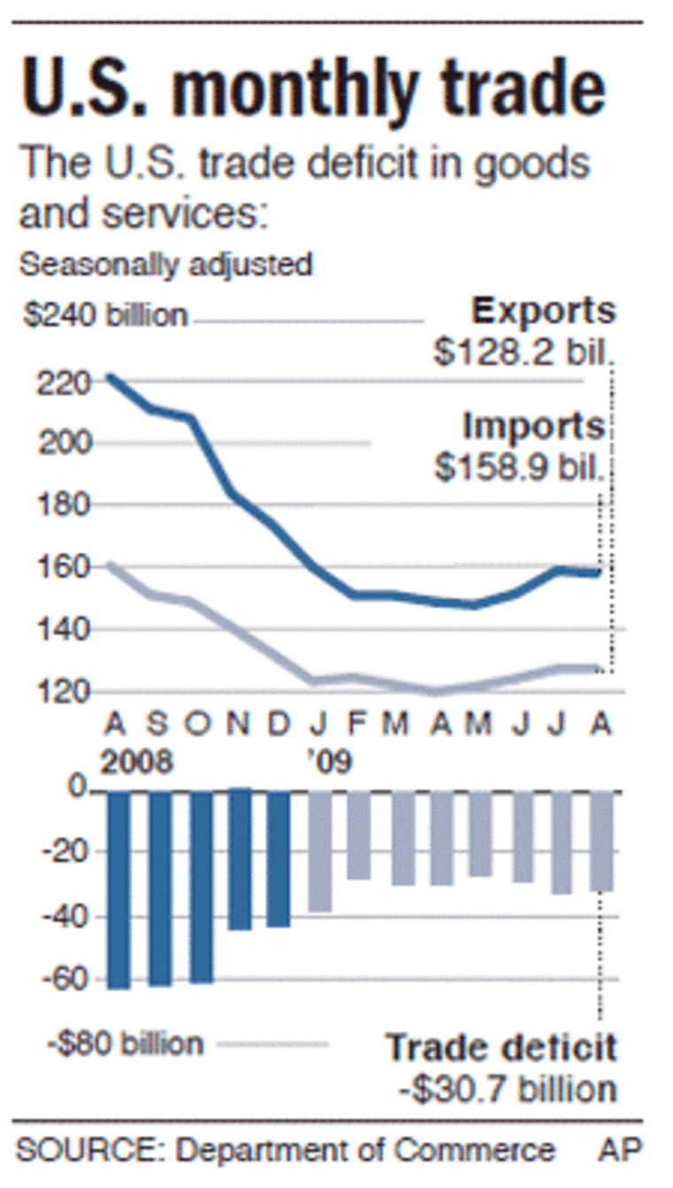 Through the first eight months of this year, the trade deficit is running at an annual rate of $357 billion, about half of last year's $695.9 billion imbalance. That huge decline reflects the recession that sharply dampened demand for imported goods.